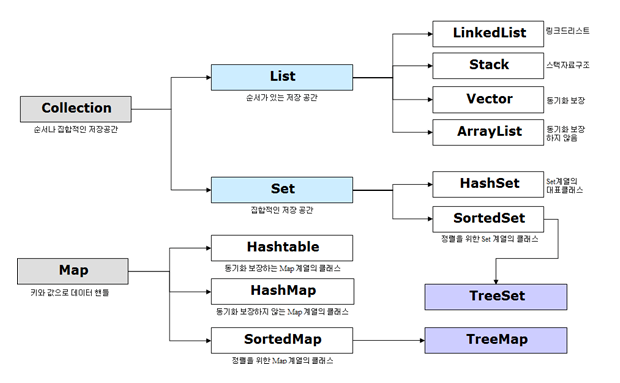 - Set과 Map 인터페이스를 상속받아 정렬 기능이 추가된 SortedSet과 SortedMap 인터페이스가 된다. 그리고 이들은 각각 TreeSet 클래스와 TreeMap 클래스로 구성된다. TreeSet과 TreeMap은 Set과 Map의 기능을 가지고 있으면서 정렬 기능이 가미되었다는 것이 특징이다.