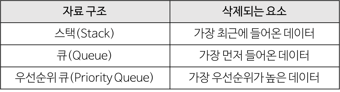 - 우선순위 큐: 우선순위의 개념을 큐에 도입한 자료 구조